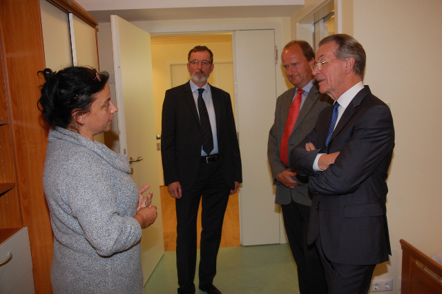 Wie aufs Stichwort erscheint eine Frau aus dem Südkreis in ihrem Rollstuhl. Auch sie freut sich, mit Franz Müntefering einige Sätze wechseln zu können. „Was hier geleistet wird, ist ein gutes Beispiel für eine gute Pflege“, sagt sie. Ihre positive Aussage sei mit der Leitung des Hauses nicht abgesprochen gewesen, fügt sie lächelnd hinzu. Für sie und alle Gäste hier werde „jeder Tag zu einem Geschenk“.