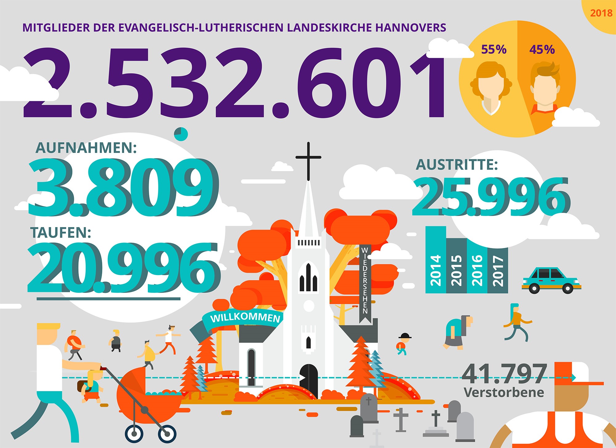 Zeitgleich mit der Evangelischen Kirche in Deutschland (EKD) gibt die Evangelisch-lutherische Landeskirche Hannovers heute ihre grundlegenden statistischen Daten zum kirchlichen Leben im Jahr 2018 bekannt.
