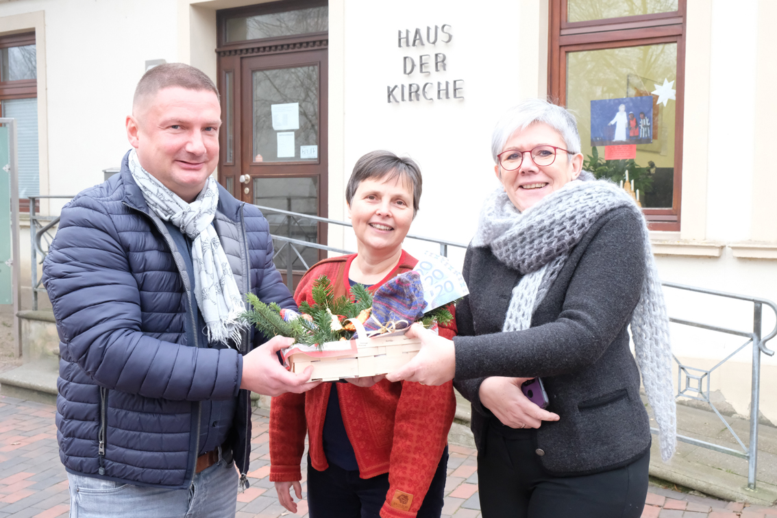 Mit 2.500 Euro hat die Abfall-Service Osterholz (ASO) den Energiefonds zum Wärmewinter des Diakonischen Werkes des Kirchenkreises am vergangenen Dienstag auf insgesamt 7.500 Euro aufgestockt. Dies symbolisierte ASO-Geschäftsführer Christof von Schroetter im Haus der Kirche in der Kreisstadt durch einen Korb mit Tannengrün, Süßigkeiten, Socken und (unechten) Geldscheinen, die er an Kirchenkreissozialarbeiterin Angelika Meurer-Schaffenberg überreichte.