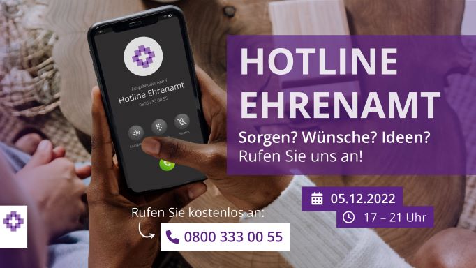 Zum Tag des Ehrenamts am 5. Dezember 2022 schaltet die Landeskirche Hannovers die kostenfreie Nummer 0800 333 00 55: Von 17 Uhr bis 21 Uhr können Ehrenamtliche mit dem Landesbischof, den Regionalbischöfinnen und Regionalbischöfen, der Präsidentin, den Vizepräsidenten und den Oberlandskirchenrätinnen und Oberlandeskirchenräten des Landeskirchenamts telefonieren.